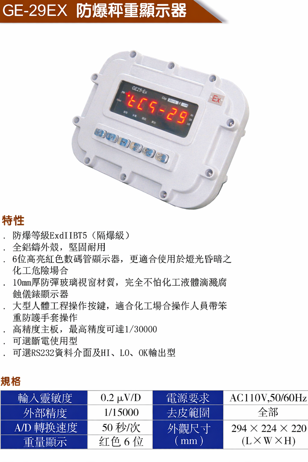 GE-29EX 為 隔爆等級(Ex d IIB T5) 設計,適用於化工廠、石化廠、粉塵環境、易燃易爆作業場所。全鋁鑄外殼搭配高亮度紅色 LED 顯示,即使在昏暗或煙霧環境下也能清楚判讀重量數據。